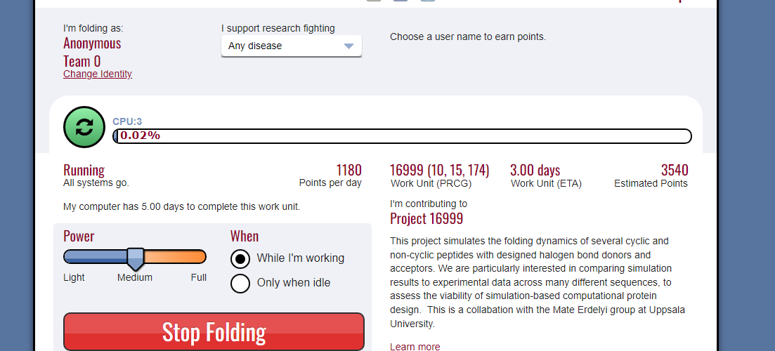 The “Power” slider defines how many resources the Folding@home tool can use. Depending on where you put the slider, the number of active cores changes. You can also define whether or not Folding@home should run while your device is actively being used or not. You can also set a resource limit with docker if that fits your needs better.