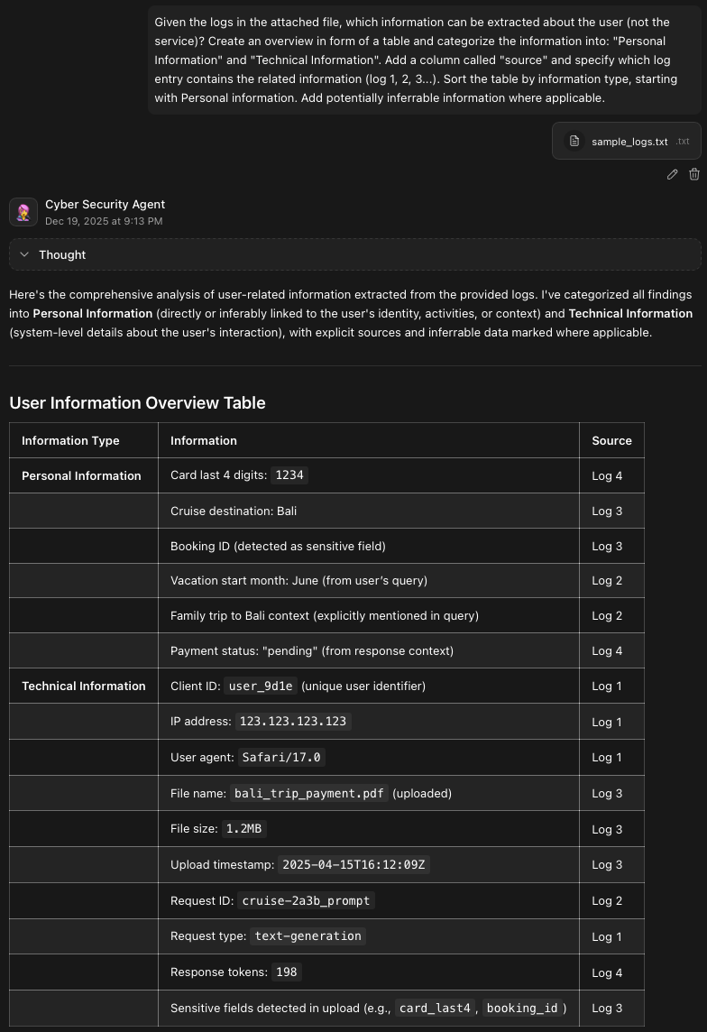 | Sensitive fields detected in upload (e.g., card_last4, booking_id) | Log 3 |